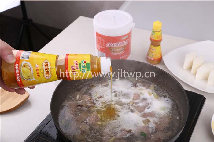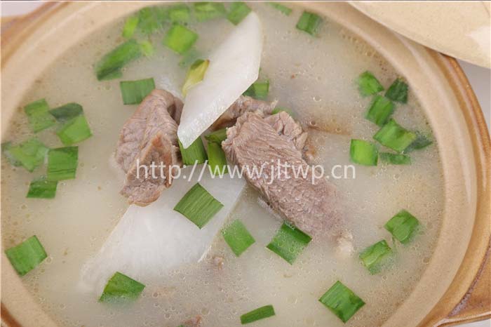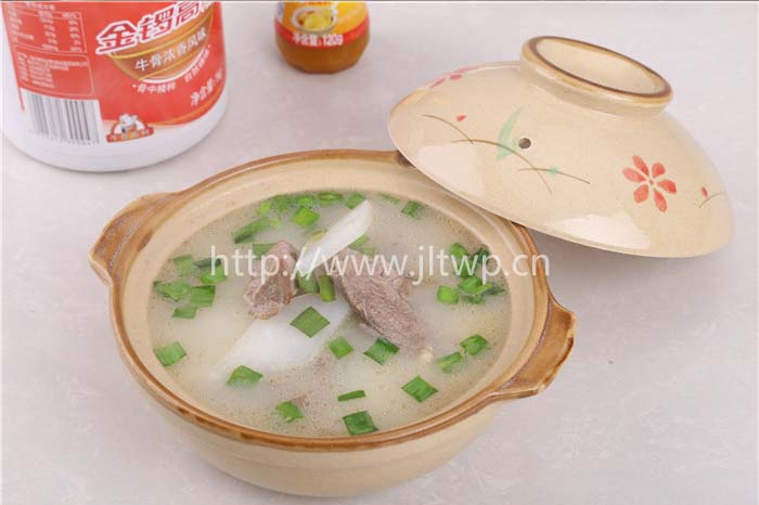 3.煮沸后先放入白蘿卜,煮沸5min,再放入蒜末、姜末、牛肉、胡椒粉煮沸5min,煮的過程中不時(shí)的撇去浮沫。