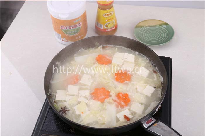 2.鍋內(nèi)加水,煮沸后加入金鑼原汁雞骨高湯、金鑼雞汁等主料;