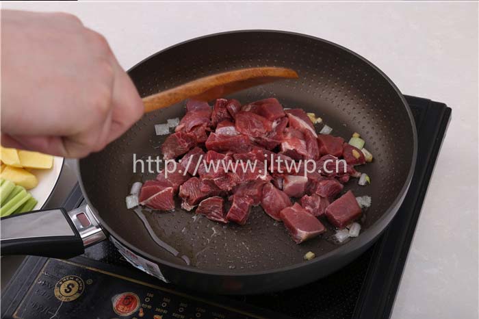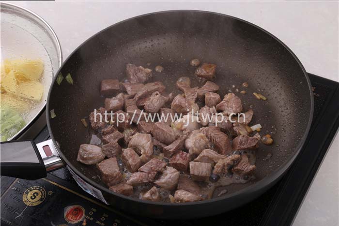 3.炒鍋燒熱后加入油,將煮過的牛肉煸炒至半熟,加入番茄醬拌勻;