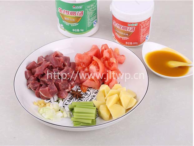 1.牛肉切塊,芹菜洗凈后切段,西紅柿洗凈后切塊,土豆去皮后切塊;